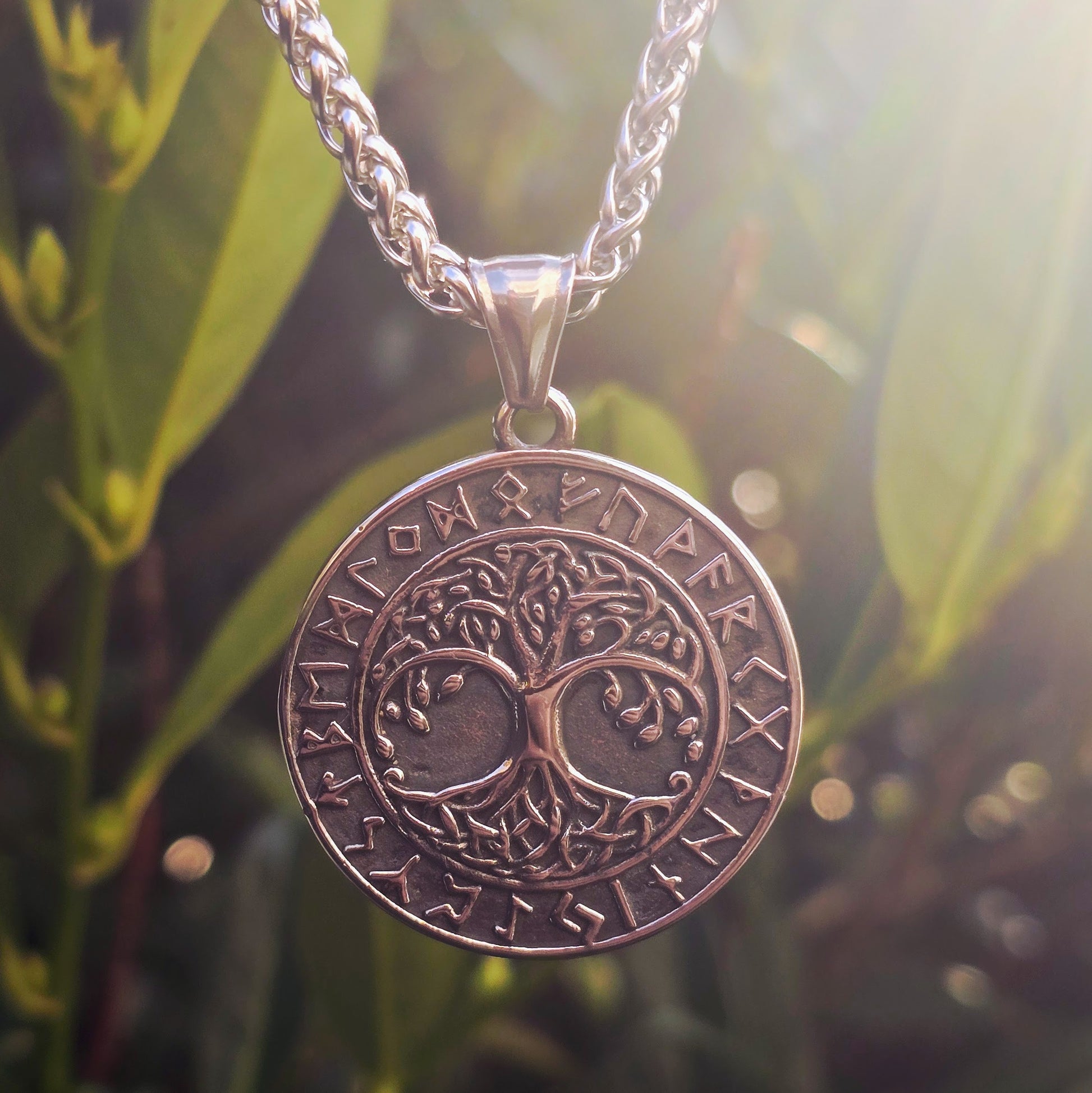 Der Baum des Lebens ist ein universelles Symbol, das die Verbindung zwischen allen Lebewesen und den ständigen Kreislauf von Leben, Tod und Erneuerung darstellt. Die umgebenden Runen tragen die spirituelle Kraft der nordischen Mythologie in sich und verleihen der Halskette eine tiefere Bedeutung und uralte Weisheit.