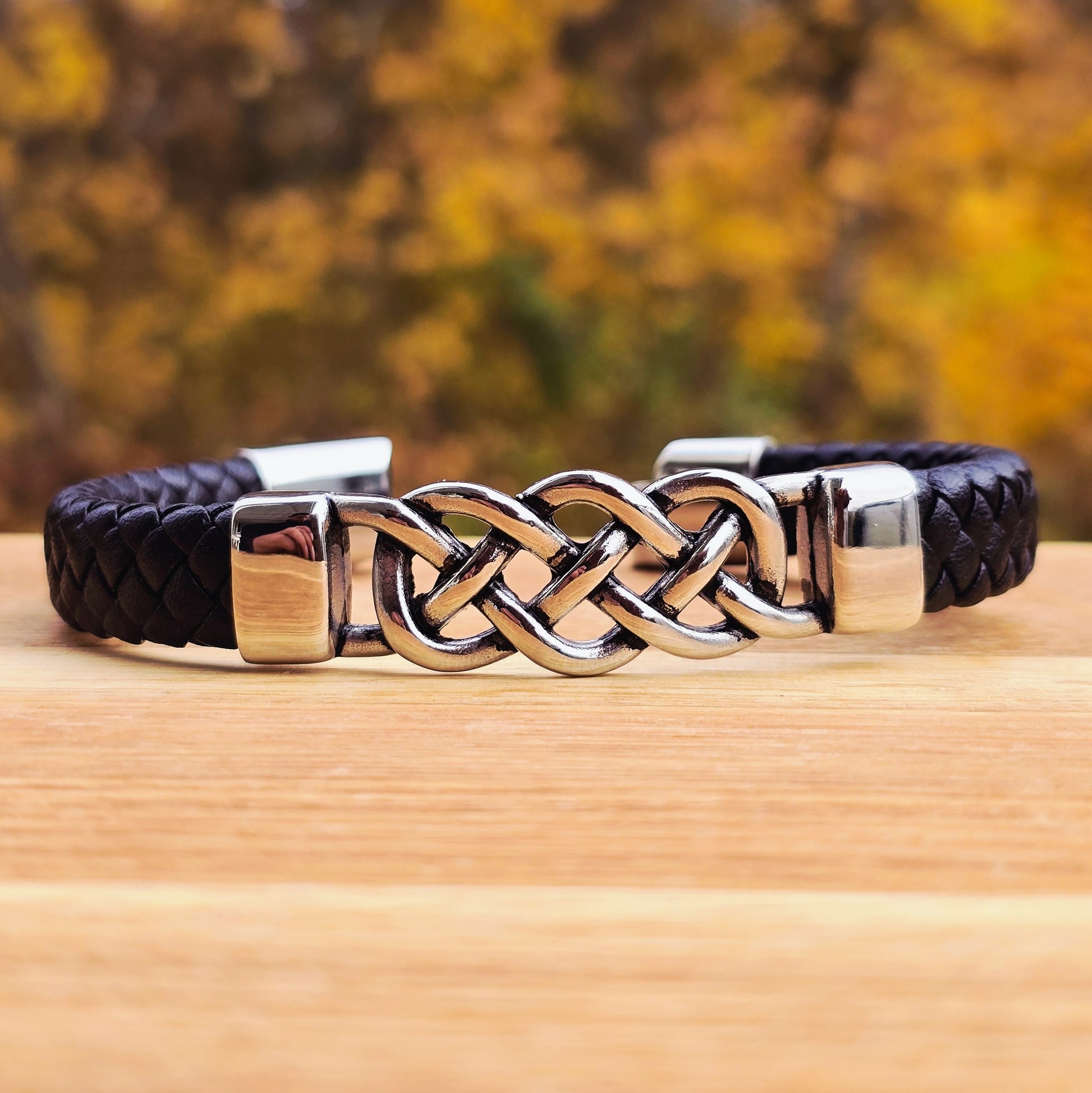 This stylish bracelet features a classic Celtic knot pattern, a timeless symbol of eternity, unity, and strength. The intricate design represents continuity and the endless weave of life and connection.