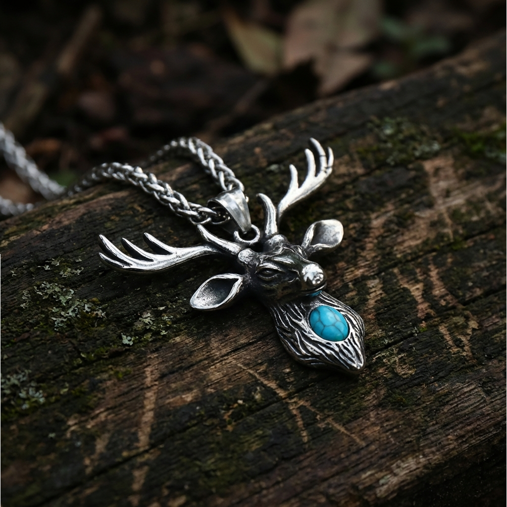 The detailed stag head is paired with a turquoise stone representing balance, protection, and inner harmony, uniting strength and calm in one powerful form.