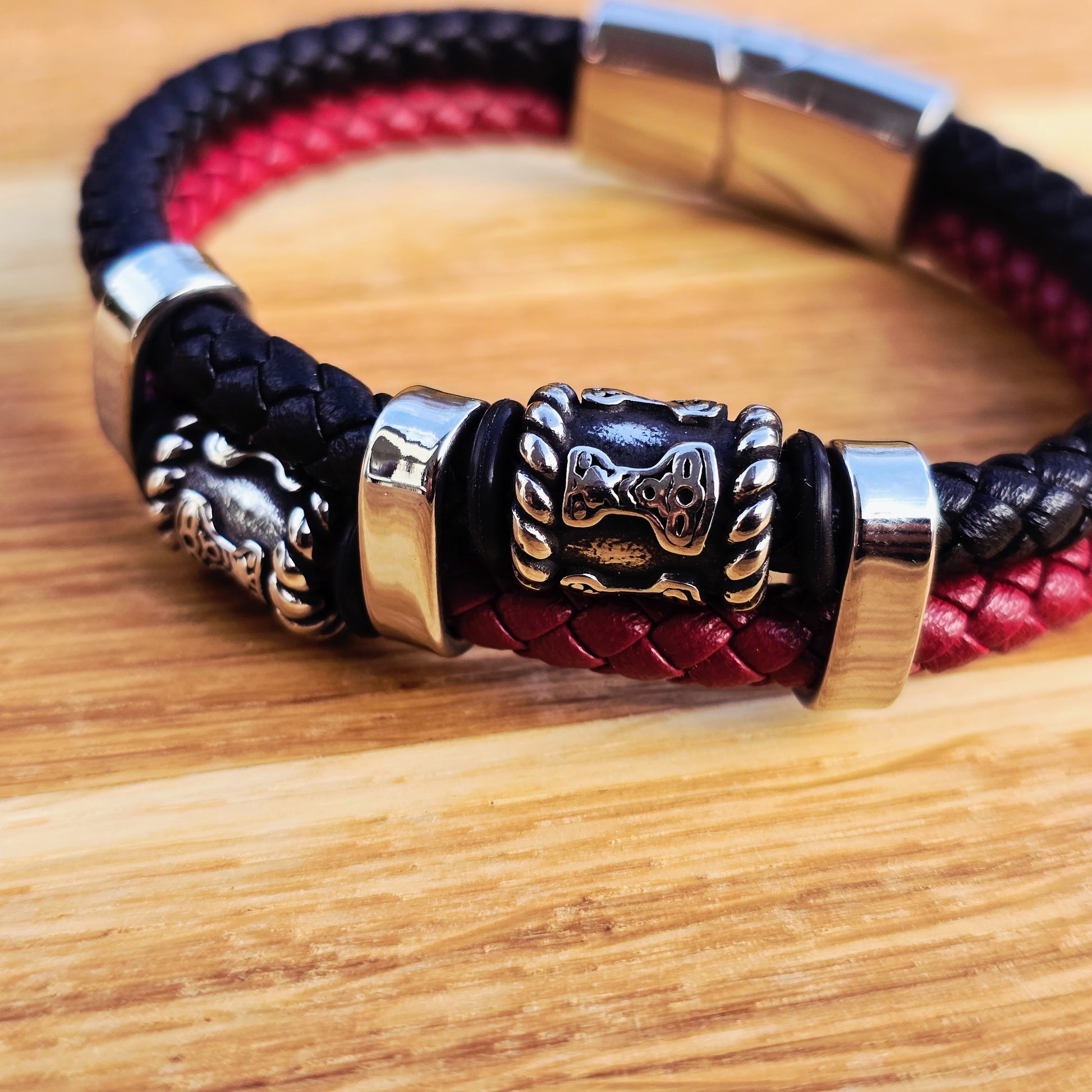 Mjölner-armbandet i svart och rött blandar Tors hammare med djärvt, flätat PU-läder.